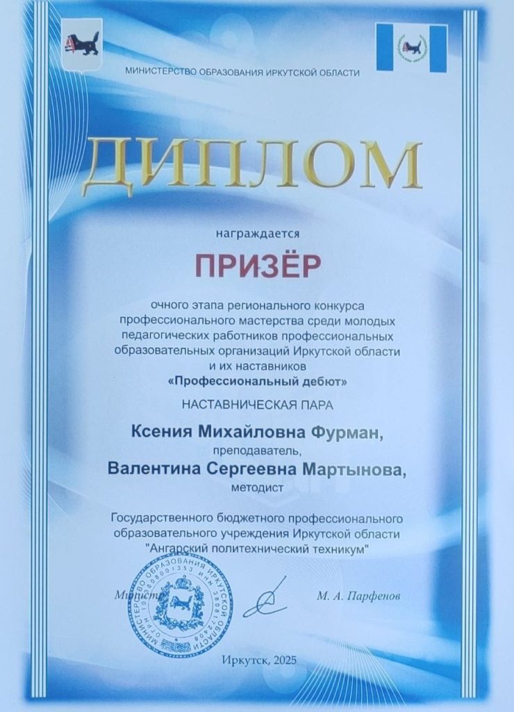 Это ежегодное мероприятие, направленное на выявление и поддержку талантливых педагогов, а также на развитие института наставничества в регионе. Конкурс «Профессиональный дебют» является важной площадкой для обмена опытом, демонстрации инновационных подходов в обучении и признания заслуг тех, кто вносит значительный вклад в подготовку будущих специалистов. Он стимулирует профессиональный рост молодых педагогов и подчеркивает неоценимую роль наставников в их становлении. В этом году среди ярких участников и призёров конкурса оказалась наставническая пара из нашего техникума преподаватель Ксения Михайловна Фурман и методист Валентина Сергеевна Мартынова, они продемонстрировали выдающиеся результаты, заняв🥈второе место🥈 очного этапа. Их совместная работа и профессионализм были высоко оценены конкурсной комиссией. Успех Ксении Михайловны и Валентины Сергеевны является ярким примером эффективного взаимодействия между молодым специалистом и опытным наставником. Это достижение не только подчеркивает высокий уровень подготовки в Ангарском политехническом техникуме, но и вдохновляет других на стремление к совершенству💫.